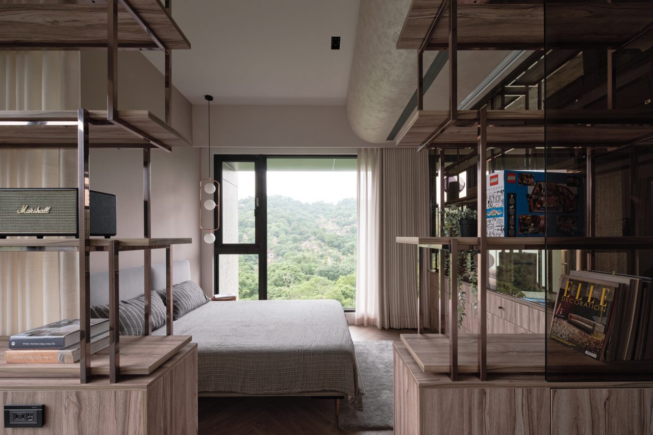 理想的家,總有各種理想的版本,隨著每一位屋主的不同個性,這個每人心中最終的歸屬之地,已不僅是睡眠休憩的角落,甚至能從空間鋪陳中,映照出屋主的生活軌跡,展現屋主獨有的風格與態度。挑高的玫瑰金鐵架,佇立沙發後方,既是整體視覺的焦點,也是設計概念的源起。由於屋主有許多珍愛的收藏,採用開放式展示架,讓書籍、公仔、傢飾、畫作,通通與室內,悠然共融一塊,並保留收納的齊整效果。無論哪個角度,充滿藏物鮮明的存在感,伴隨得意神氣的成就感,收藏的趣味,在這些時刻愈發靈動。考量空間本身的小尺度,不刻意劃分客廳與臥室,透過金屬層架的運用,巧妙地通透視覺、界定場域,同時以茶色玻璃增加隱密性,穿透卻又內斂,朦朧柔和的氣息悄然蔓延。