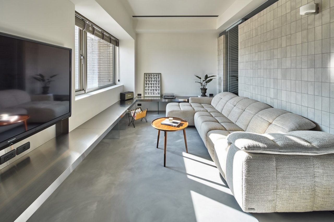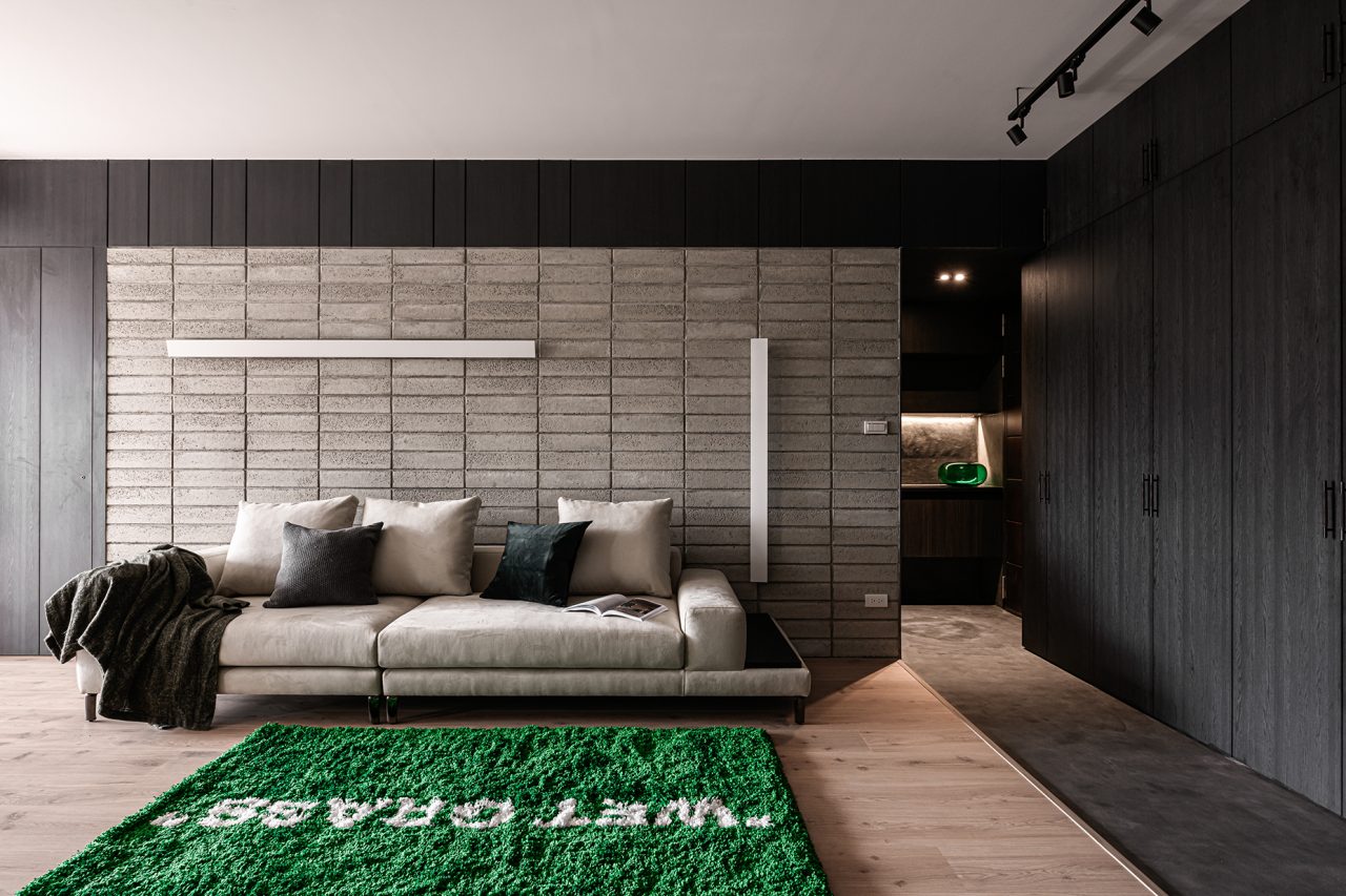 希望在喧鬧的城市生活中提供一個回家能夠放鬆的空間,以灰色中性調做為主軸,堆疊深淺不同不同紋理的材質及線條,在光影變幻渲染間,堆疊出一份獨特的寧靜。 生活的美學從各式經驗中層層堆砌而出,透過不同材質層疊穿插襯托出獨特的寧靜。形體上運用客餐廳、臥室的圍牆磚到浴室的西班牙手工磚的堆疊,色彩上層覆著不同深淺的灰,在光影變化渲染或近或遠間,疊砌成一份沉謐。