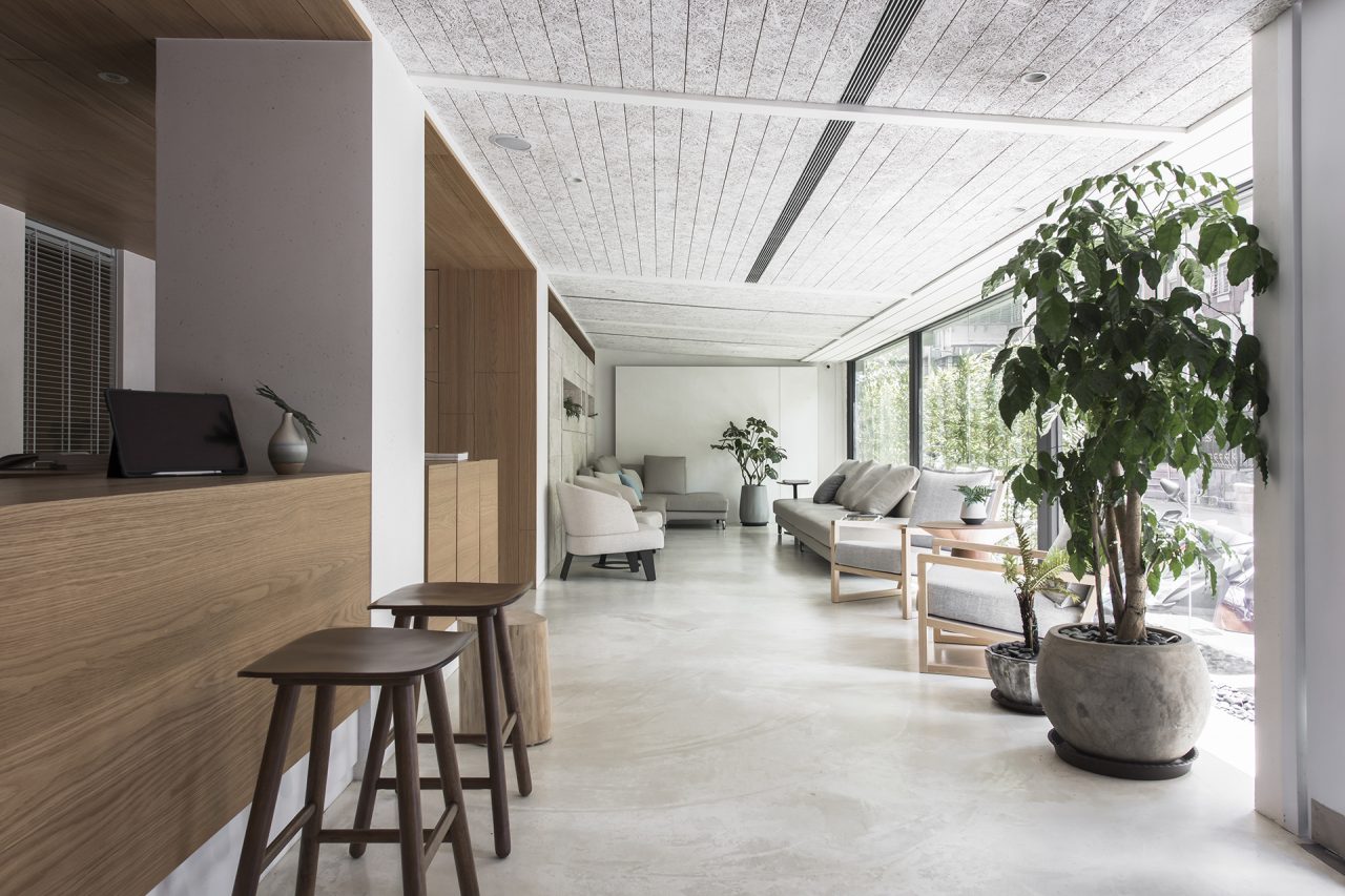 樸實無華的材質肌理與簡樸的形體呈現刻劃出的靜謐氛圍,在喧嘩的巷弄中提供了一份寧靜給即將踏入店內的客人;運用甘蔗板與橡木皮形塑ㄇ字型兩種不同材質的天花搭配著無接縫地坪,輕輕地界定出櫃檯區與等候區,客人從接待、等候到入內可以很自然地接受服務人員的指引。入內的護膚區壁漆中摻入了稻草梗,在天花及櫃體的間接照明輝映下圍塑出寧靜的氛圍,浸身在其中地感受材質簡單樸實的溫度包覆。透過層層的動線安排,漸漸地洗滌外面的喧鬧,讓人真正地沉靜下來享受寧靜的時光。